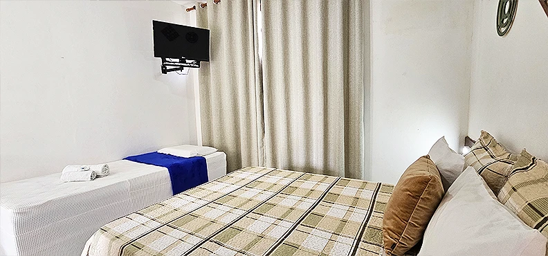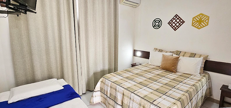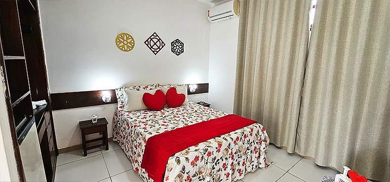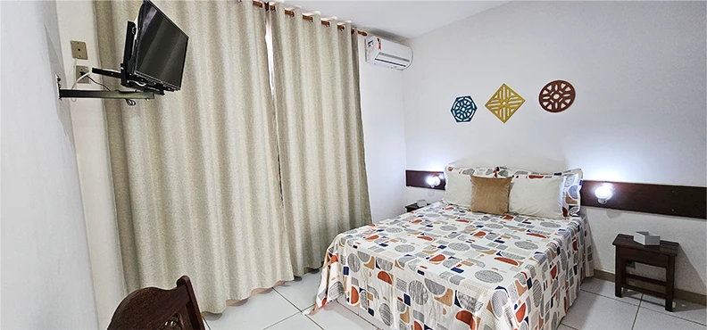 São 30 apartamentos confortáveis, decorados e espaçosos, que dispõem de ar condicionado, tv, frigobar, armário, mesa com cadeiras, cofre eletrônico, banheiro com blindex e água quente solar. Possuímos apartamento equipado para portadores de necessidades especiais, área verde com piscina adulto e infantil, toboágua, serviços de bar, restaurante, cozinha exclusiva para bebês e café da manhã tropical de cortesia na diária. Além disso, dispomos de salão de convenções com capacidade para até 100 pessoas, recepção 24hs, estacionamento fechado com circuito de câmeras de segurança, wi-fi e gerador.
