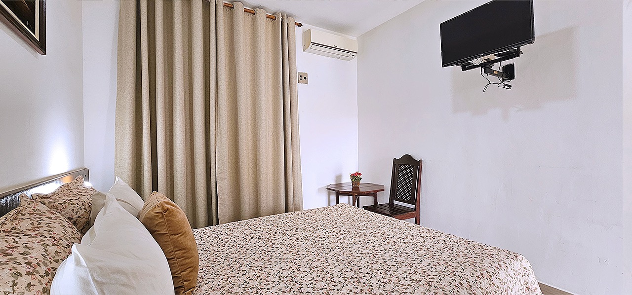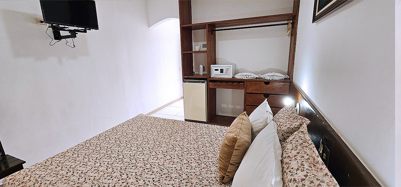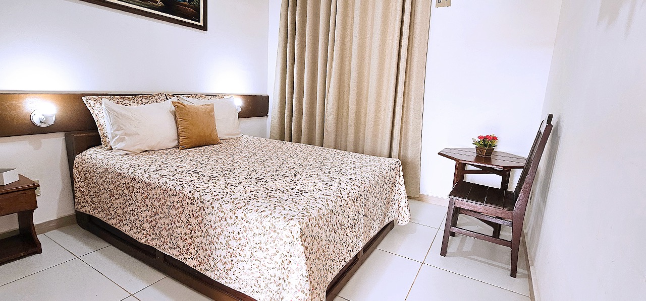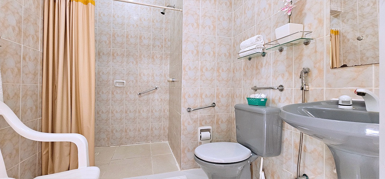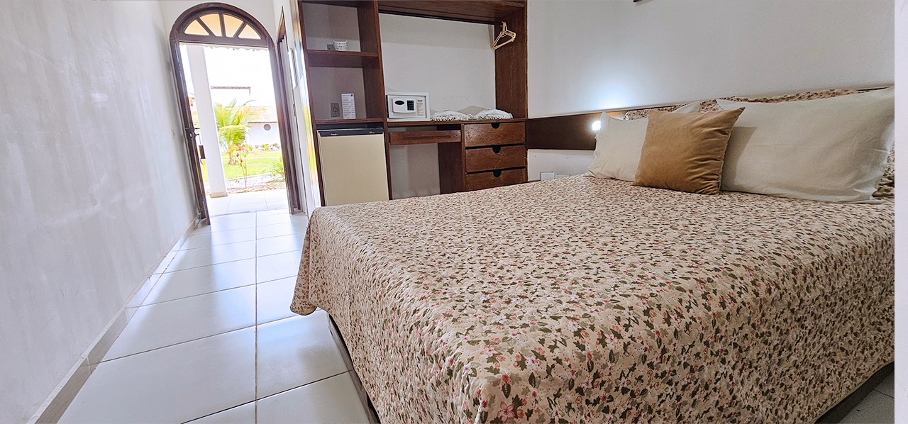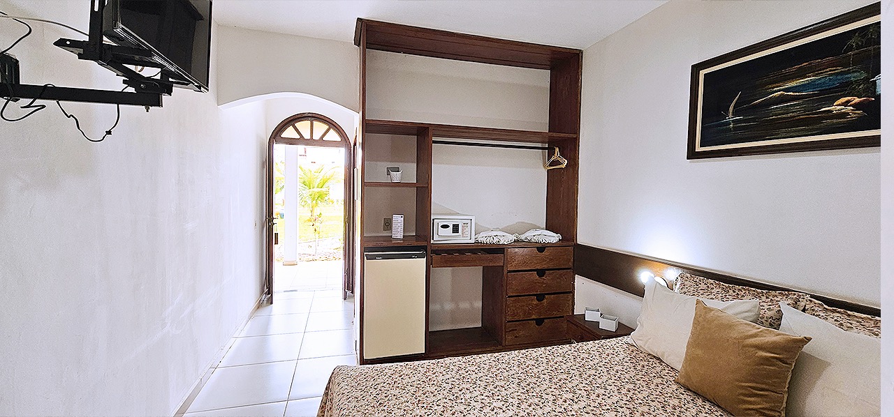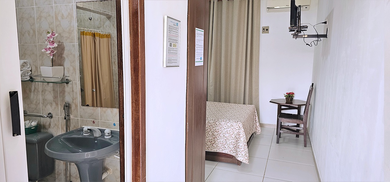 Apartamentos Pcd para até 02 pessoas, dispondo de porta de entrada com abertura central, banheiro com porta sanfonada, barras de sustentação e chuveiro com cortina, ar condicionado, tv, frigobar, armário, mesa com cadeiras, cofre eletrônico, wi-fi e água quente solar, além do café da manhã tropical de cortesia na diária.